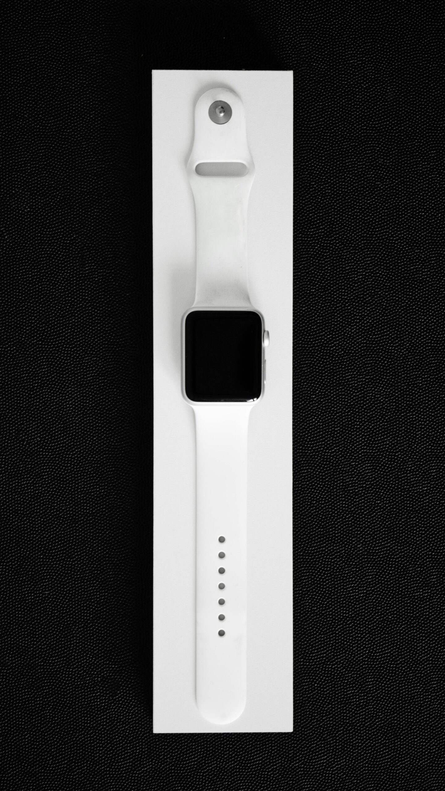 White smartwatch showcased in a minimalist style on black background, emphasizing modern design.