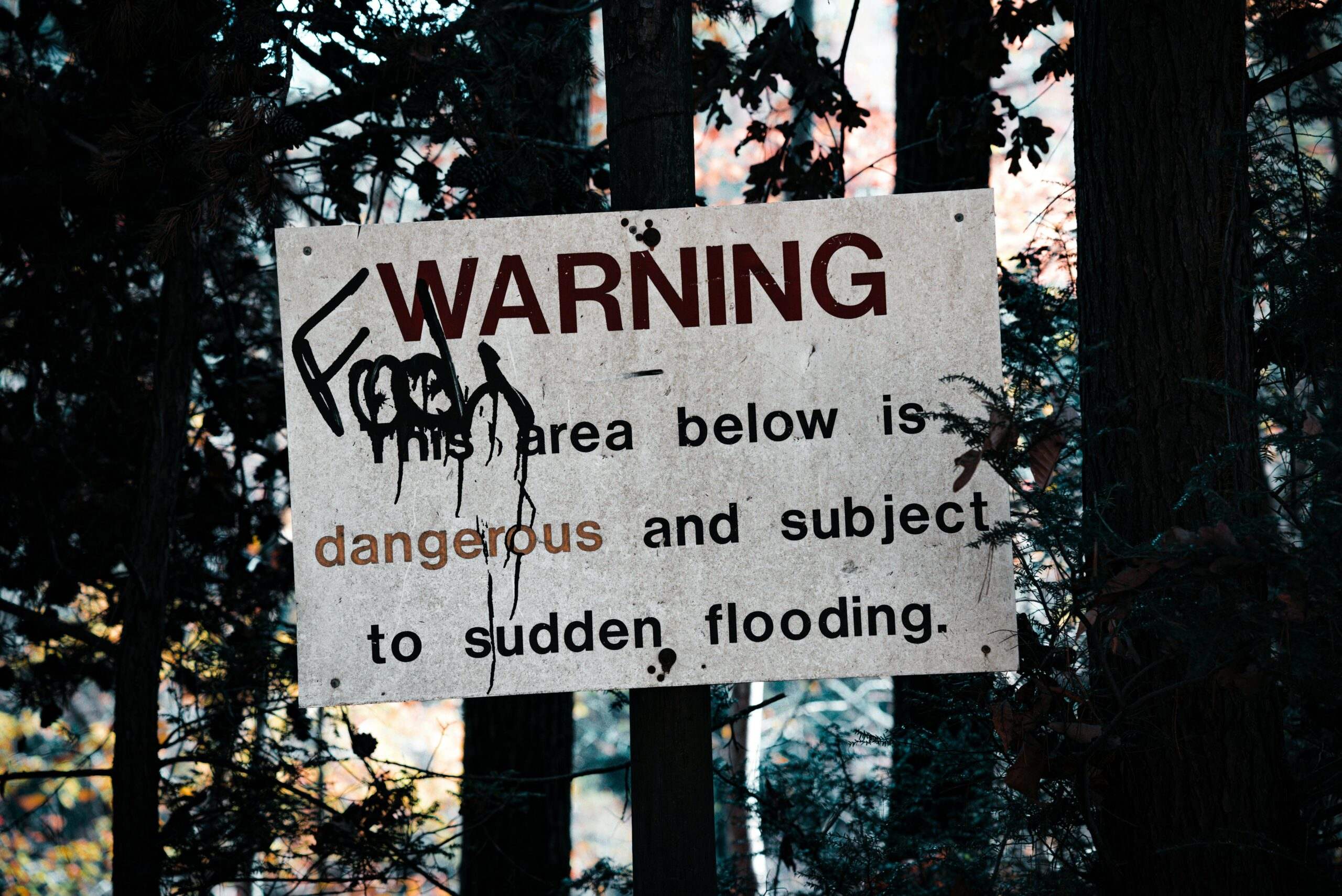 A warning sign about sudden flooding amid a forest setting, emphasizing caution.