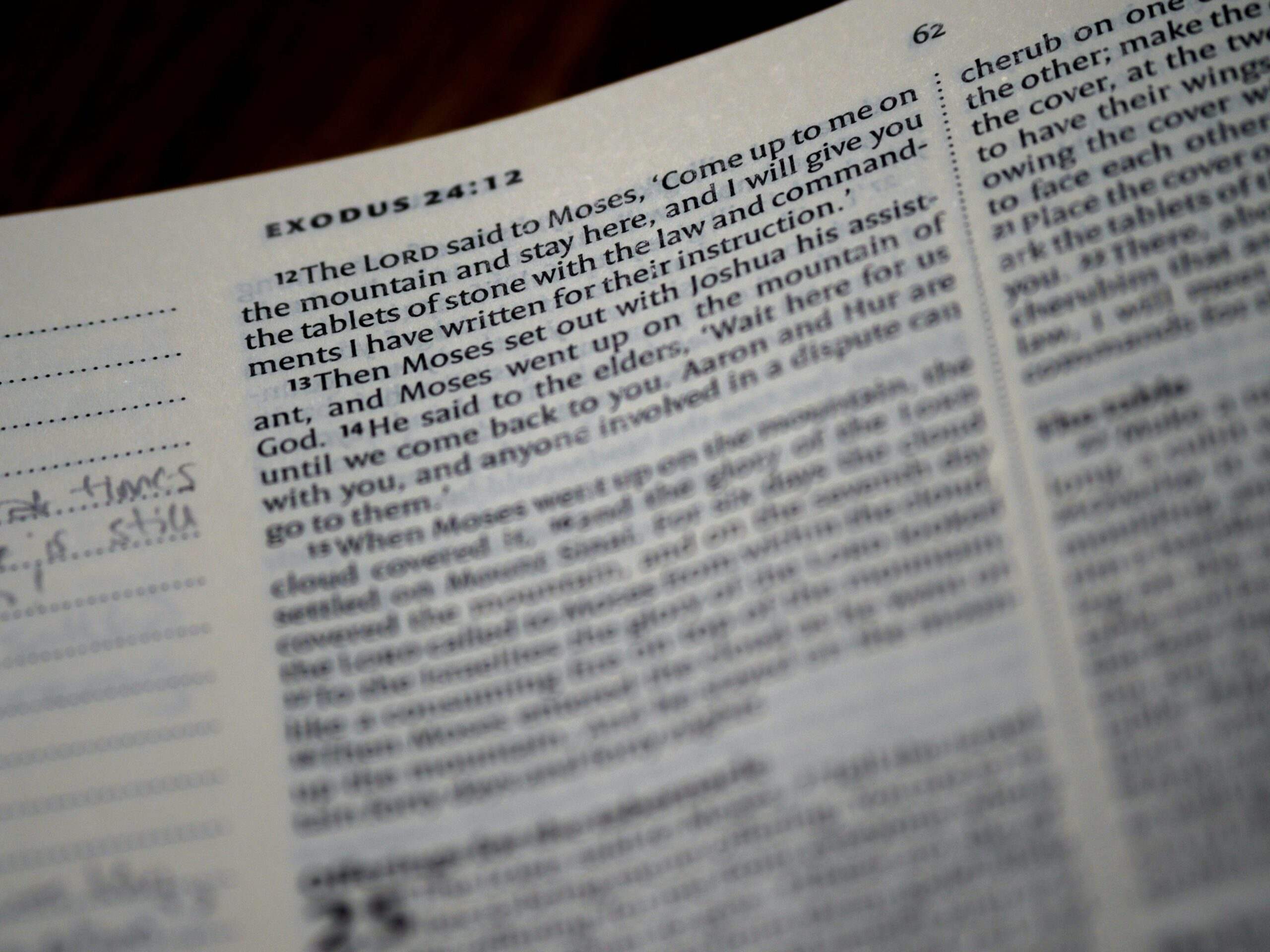 Close-up of an open Bible displaying text from Exodus 24:12.