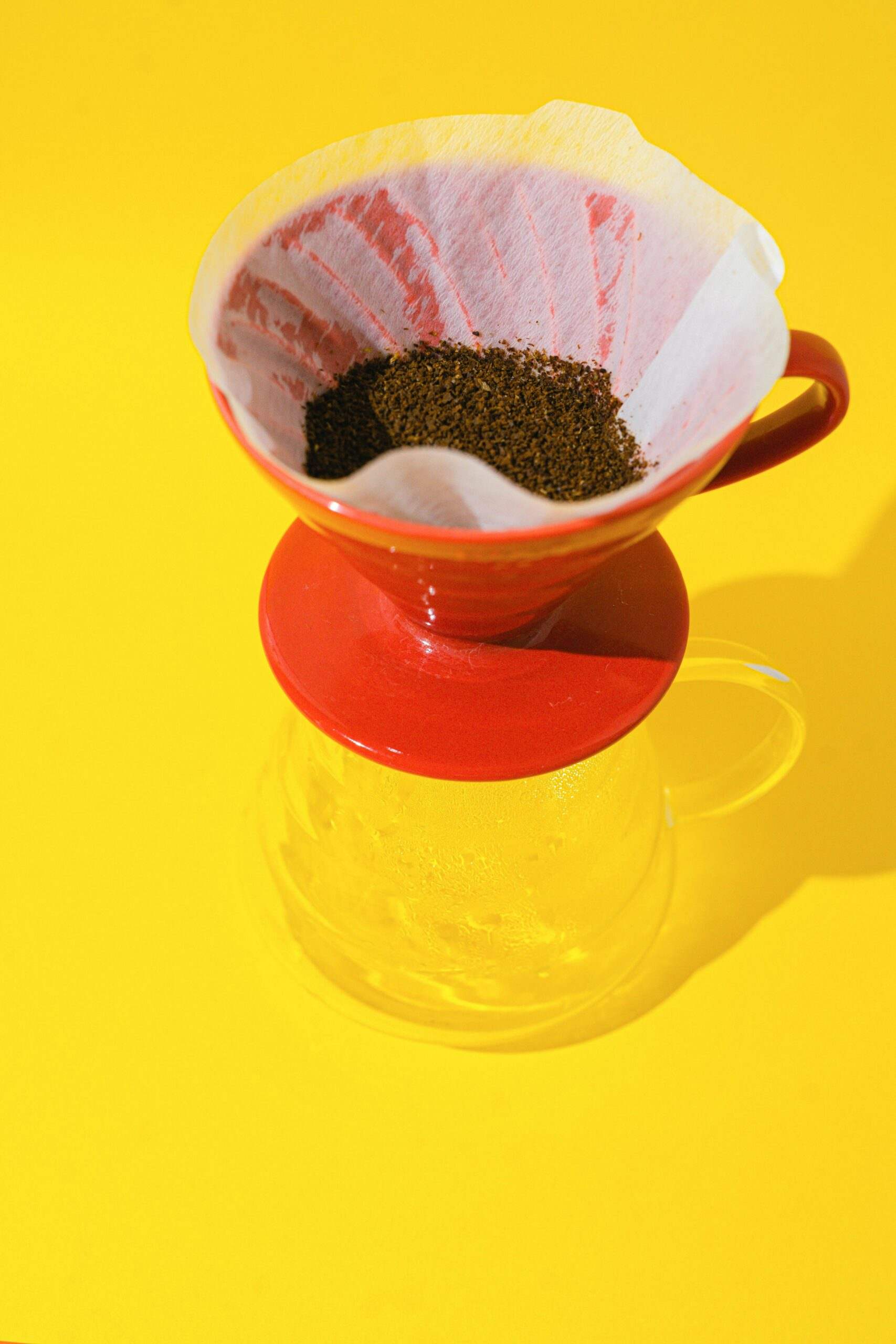 A vibrant close-up of drip coffee preparation using a red coffee dripper and filter paper against a yellow background.