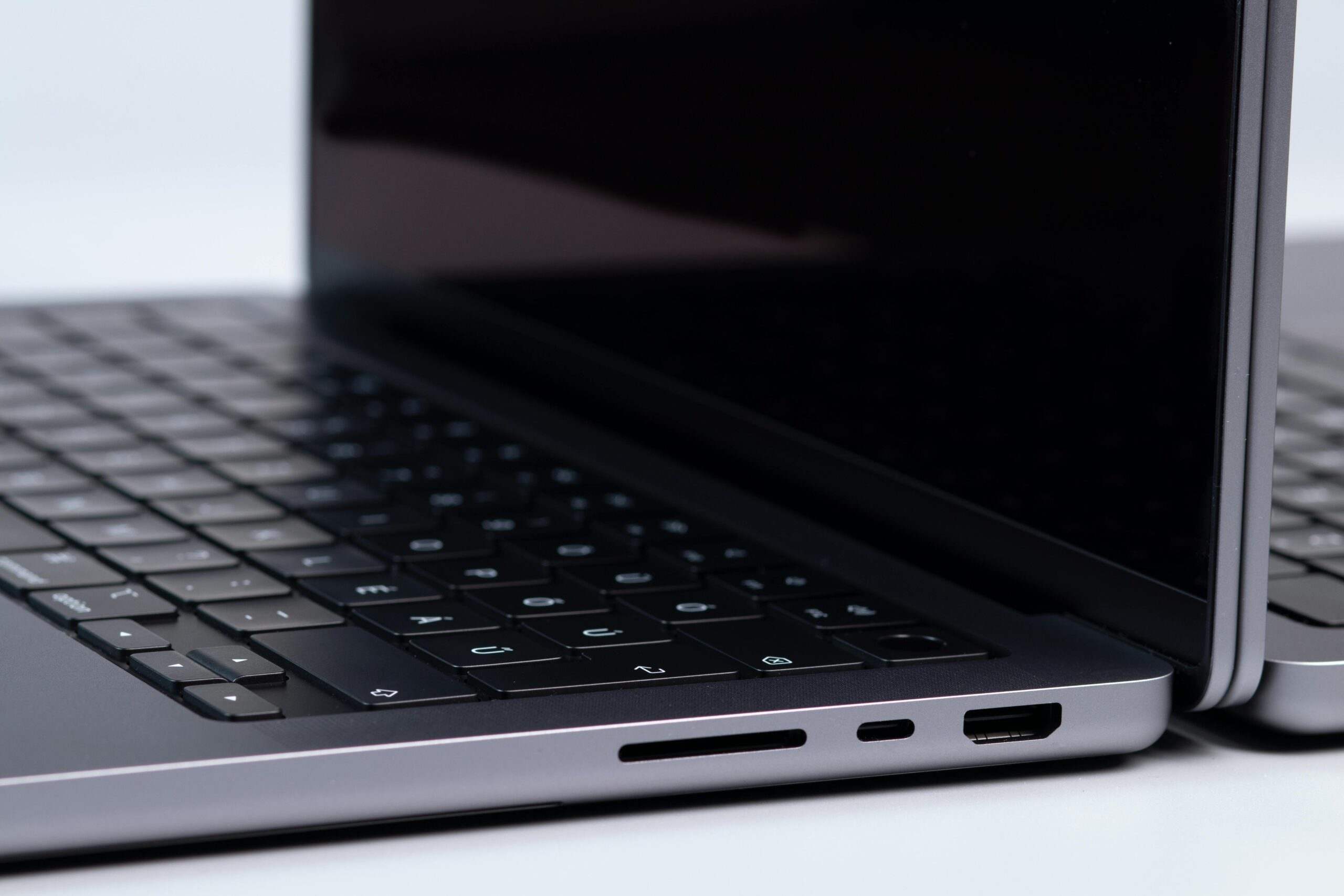 Detailed view of laptop ports and keyboards on a white surface, showcasing modern technology.