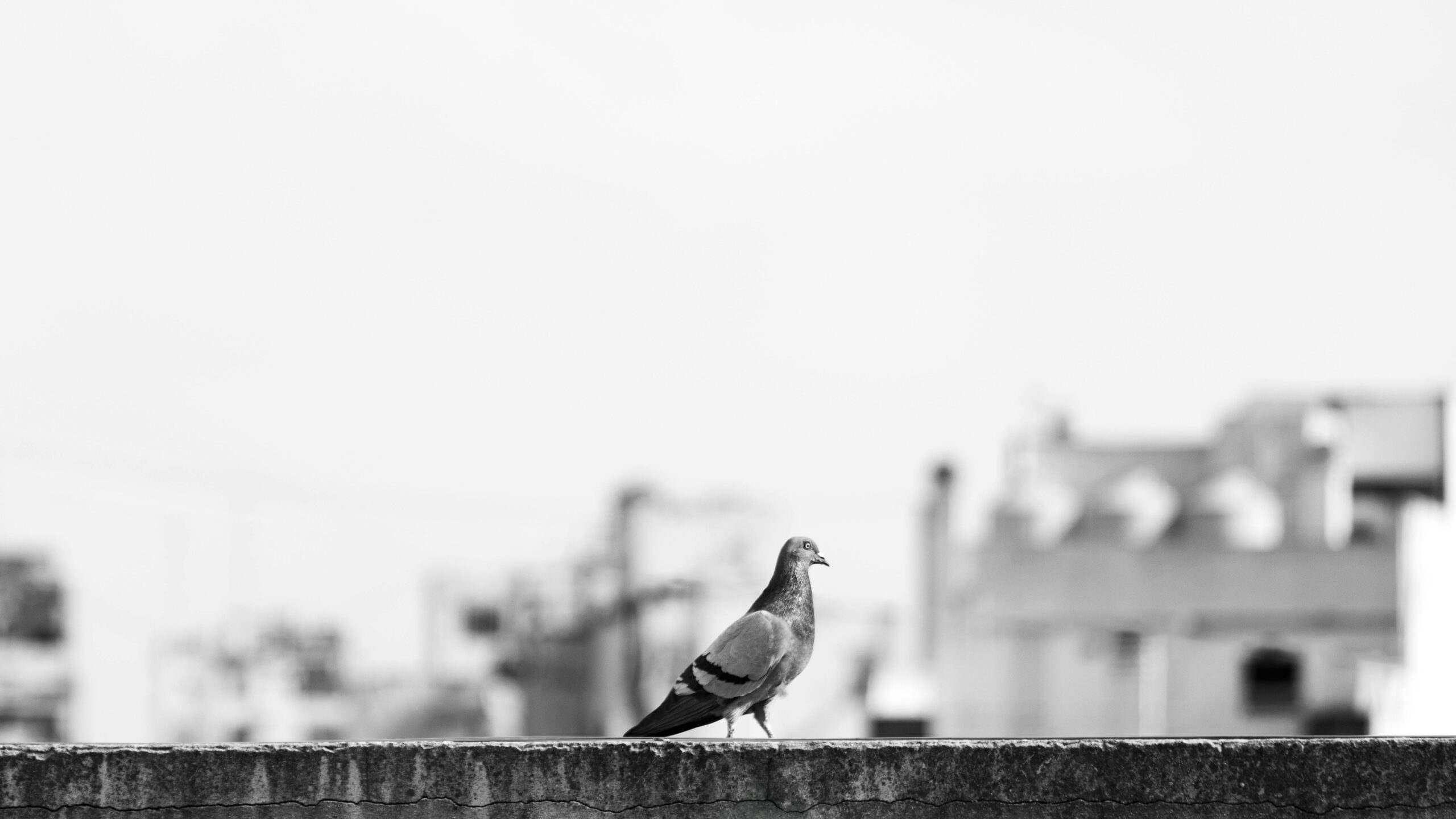 Monochrome photo of a pigeon on a ledge with Buenos Aires architecture in the background.